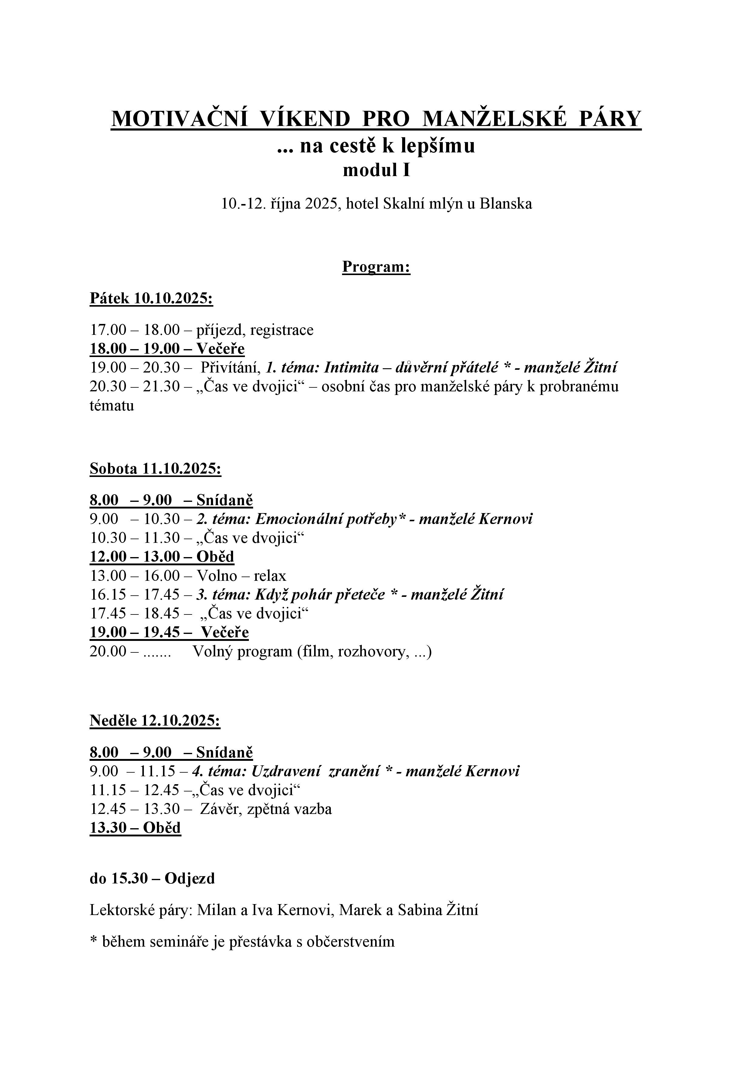 6500KčTěšíme se na Vás na dalším Motivačním víkendu pro manželské páry. Přihlášky posílejte nejpozději do 6.10.2025 na emailovou adresu sabina@zitny.cz