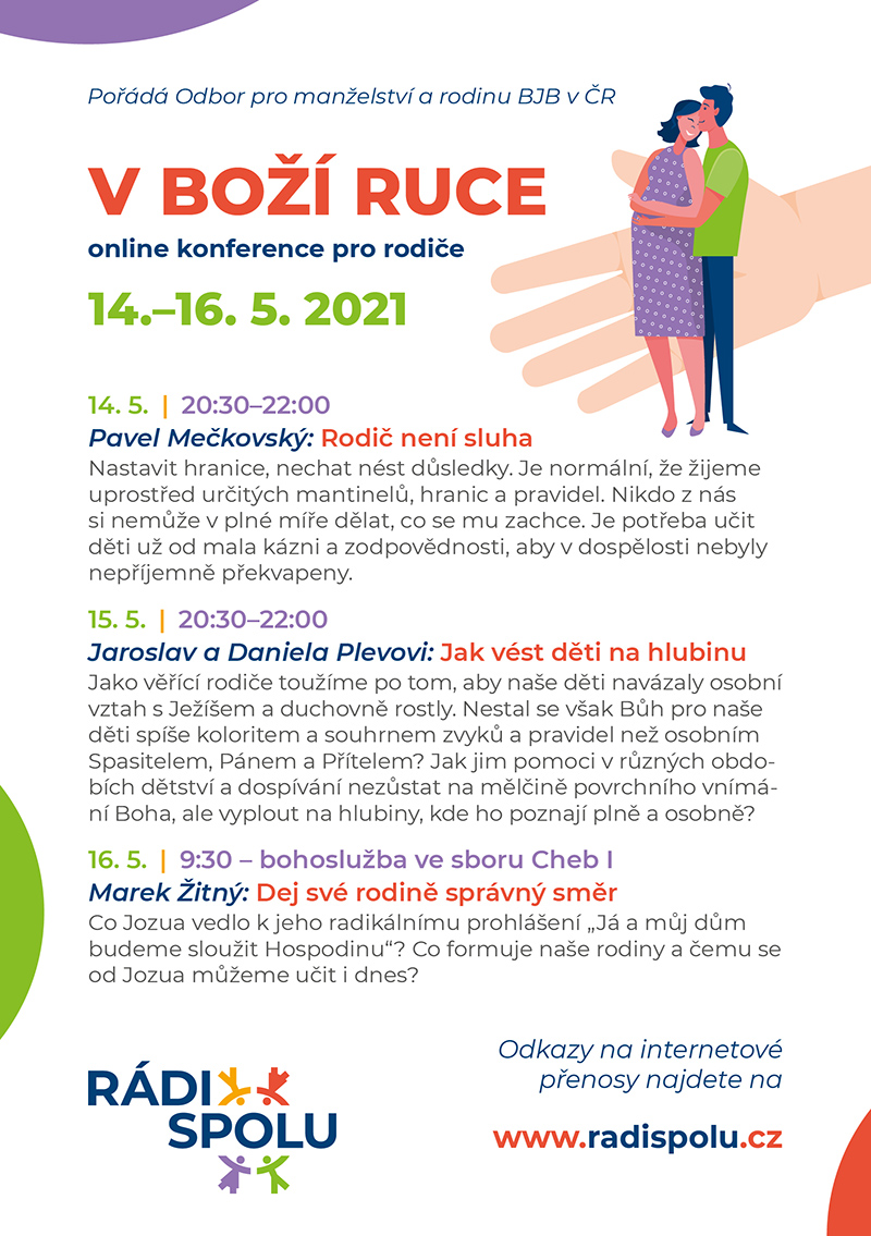Zveme vás na konferenci pro rodiče. Jsme rádi, že vás můžeme pozvat i přes to, že jsme kvůli epidemiologické situaci byli nuceni již dva každoroční termíny zrušit. Tentokrát však využijeme online prostoru a můžeme se spojit od Aše až po Ostravu. Takže těšíme se 14.-16. května na slyšenou a viděnou 🙂